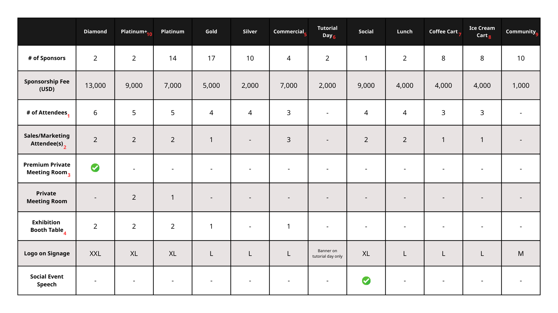 The number indicates complimentary passes for the event. Sponsoring ASN/Organizations will not be allowed to register more than the number specified. (Sponsors with exhibition booth tables will receive one booth-only pass in addition to allocated numbers of attendees. This pass does not grant access to the conference sessions, lunch, social or the meeting tool. E.g., Diamond sponsors: 6 attendee passes + 1 booth-only pass.) - Sales/Marketing Attendee(s):